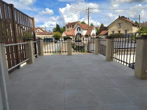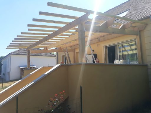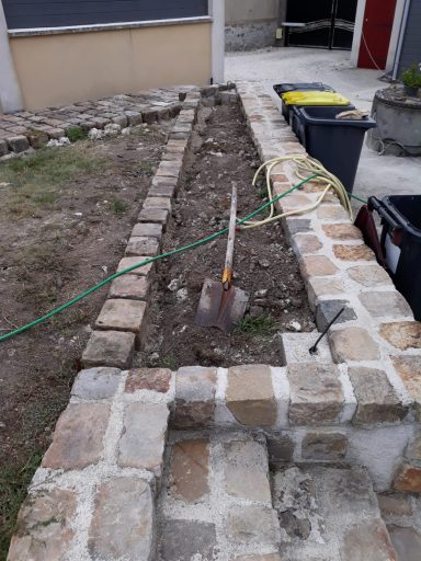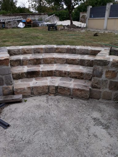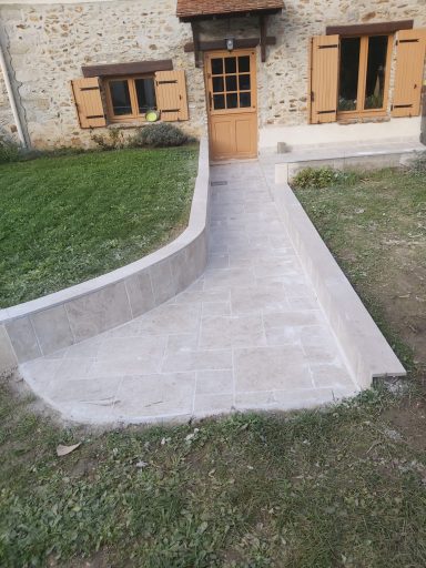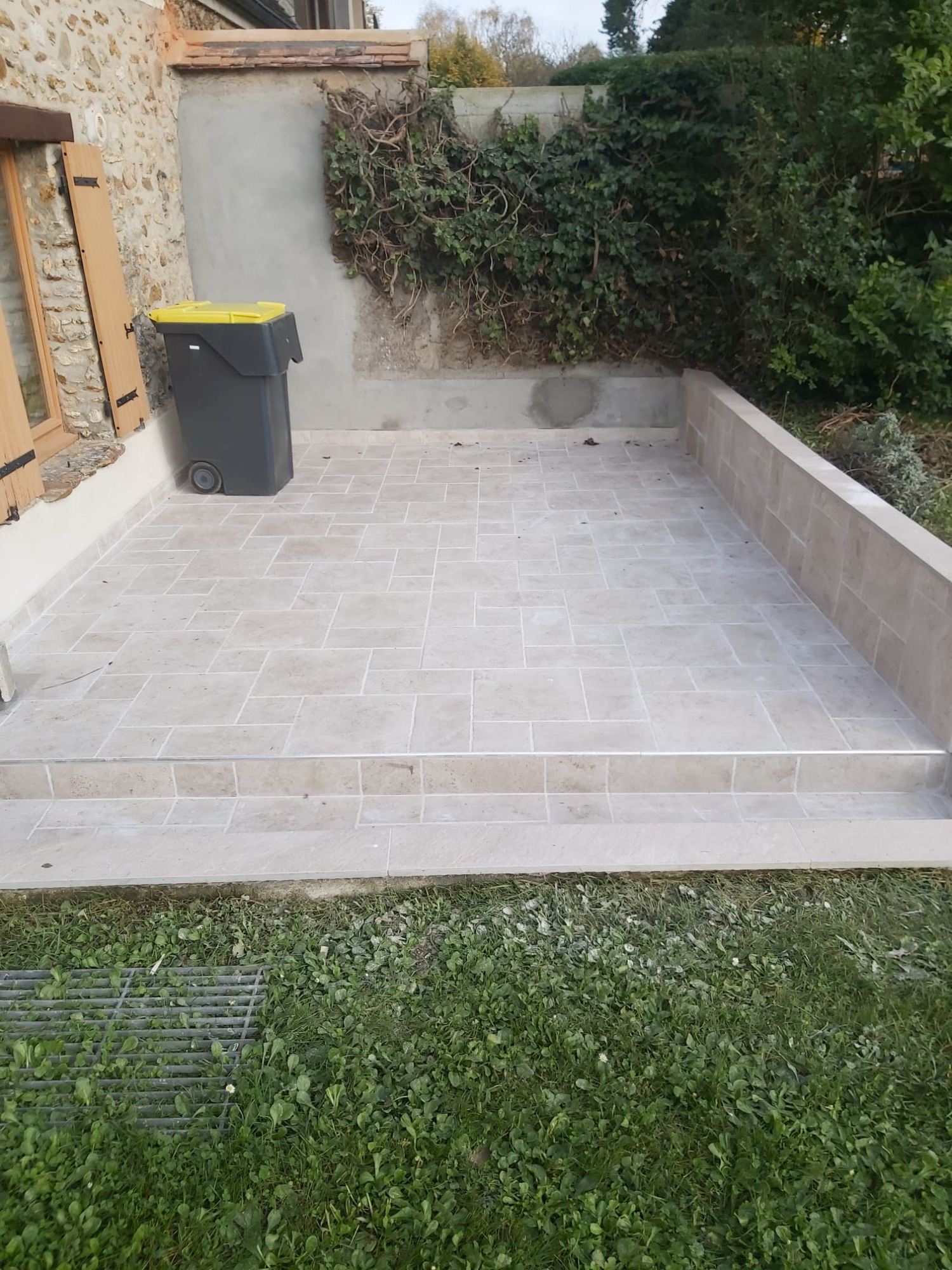 Création de terasse, carrelage extérieur,jardinière en pierre, préau bois.